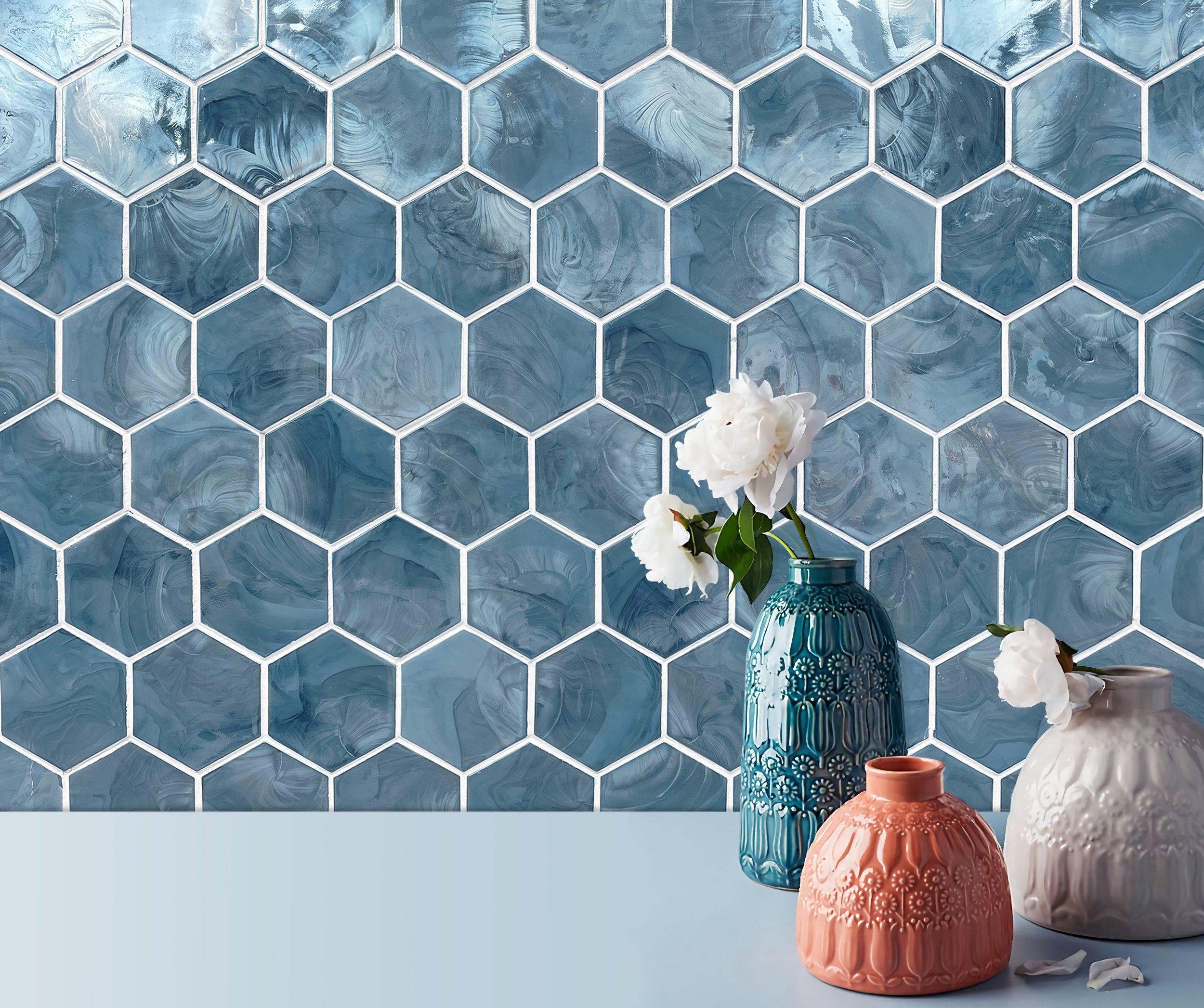 Add an accent to your design with this 11 x 12 hexagon & octagon Stella Hexagon Hot Glass Mosaic. The blue color will enhance any space.